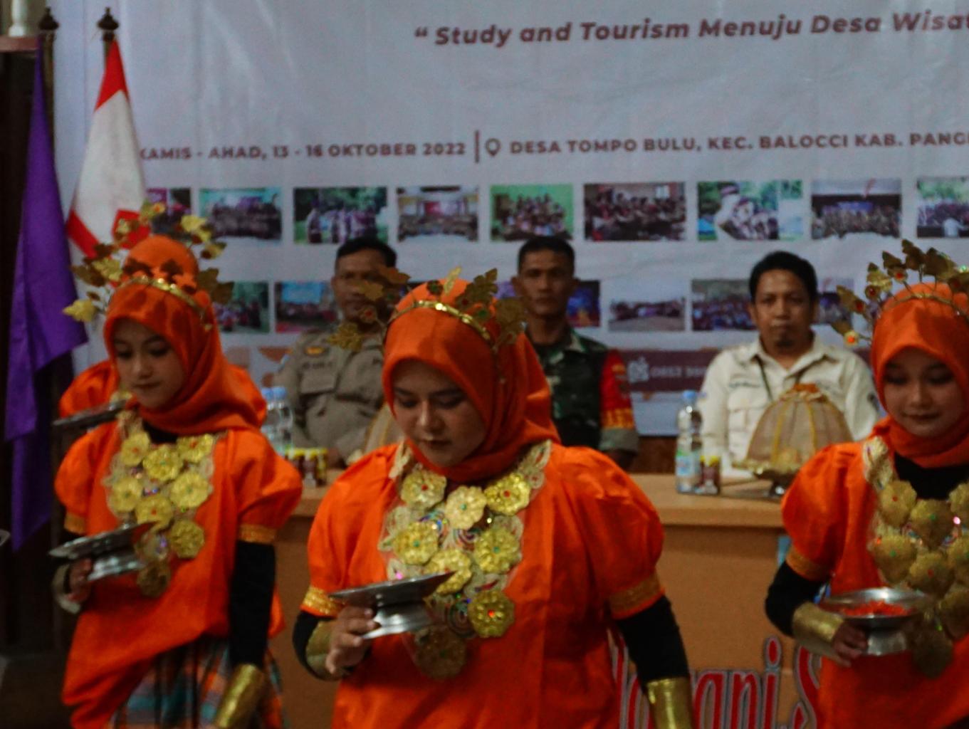 seni tari ini diperangkan pemuda pemudi desa secara aktraktif dan kolaboratif,lenggak lenggonya,lambaian tangannya menandakan keramahan dan telulusan terpancar dari senyum yang di suguhkan terhadap para pengunjung di desa tompo Bulu.,untuk menyaksikan seni tari ini pun tak akan susah karena telah di bina sesuai tingkatan usia di bangku sekolah sebagai wujud pelestarian adat seni dan budaya bangsa.