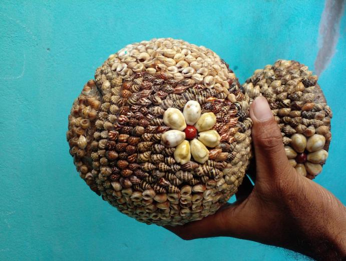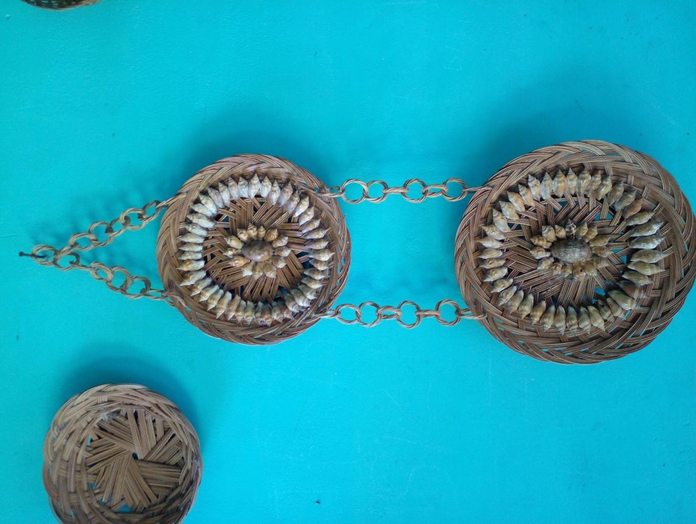 hiasan dinding yang di jual, di produksi dari alam sendiri yaitu dengan menggunakan lidi atau tulang daun kelapa dan hiasan kulit keong dan kerang
